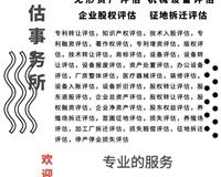 【服务范围】:净资产评估,无形资产评估,各类设备评估,拆迁房产土地评估,车辆评估,技术评估, 商标专利评估,知识产权评估, 版权评估,侵权评估,企业价值评估,股权评估, 各类工程项目评估,农林牧渔业评..
